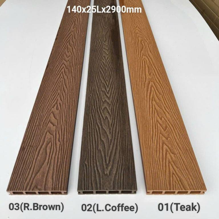 Sàn gỗ nhựa ngoài trời 2D có thiết kế đ vân gỗ 3D, có chiều dày 2,5cm, rộng 14cm, dài 290cm.